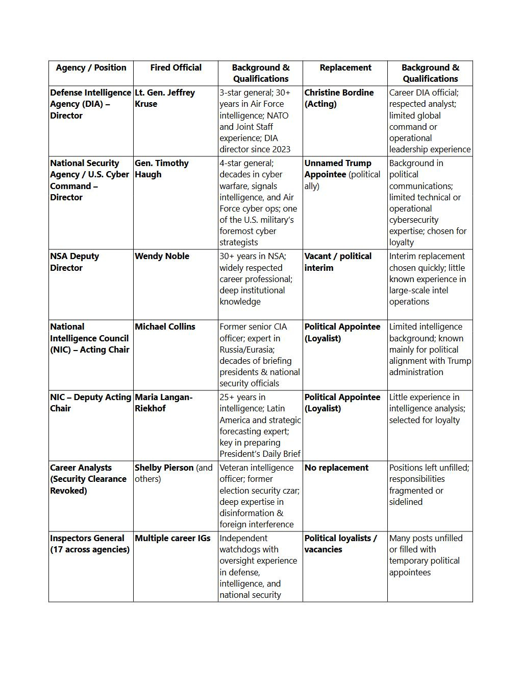This is not mere reshuffling—it is a purge. Professionals with unparalleled expertise in cyber defense, global strategy, and intelligence forecasting are being removed, and their untested and unqualified replacements chosen not for competence but for loyalty. The consequence is an intelligence community that no longer informs policy but bends to it. That is not national defense. That is surrender. Here are just a few examples. There are many more I could have added.